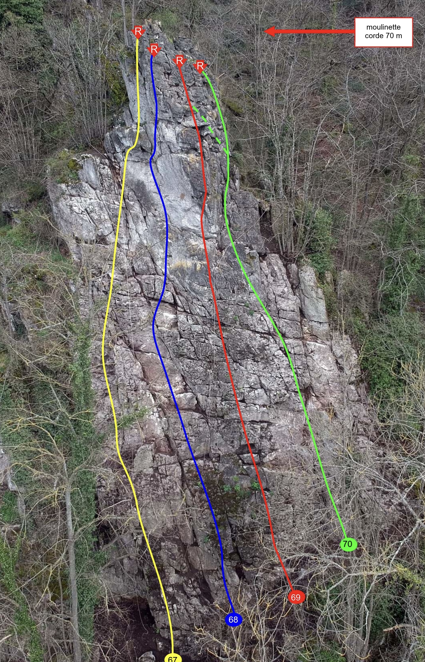 Quelques vieux pitons encore présents attestaient de l’existence d’anciennes voies mais aucune trace n’a pu en être trouvée dans les archives et topos précédents. Seule une inscription « Les Vires » est peinte sur le rocher. Nous avons donc choisi de nouveaux noms. De gauche à droite : la « Alain-Jean Cri » (4c) en hommage à nos amis Alain Thomas et Jean-Christophe Peers, décédés au Grand Combin en juillet 2017, les « Renards Grisonnants » (5a+), les « Vires » (5a+) et la « Jantye » (3c) en souvenir de Georges Janty, ancien président du CAB et secrétaire de la section de Namur Luxembourg.